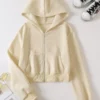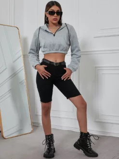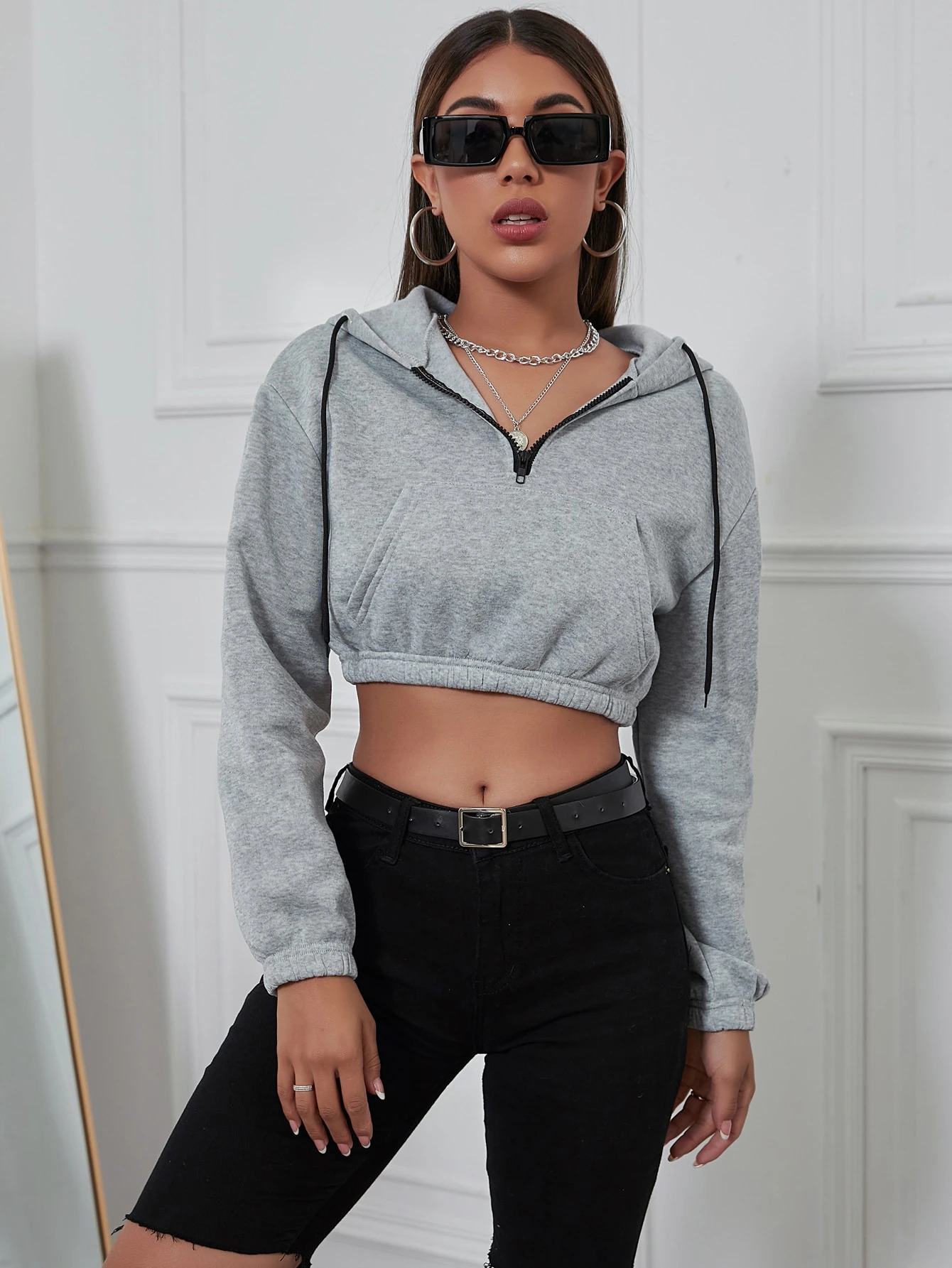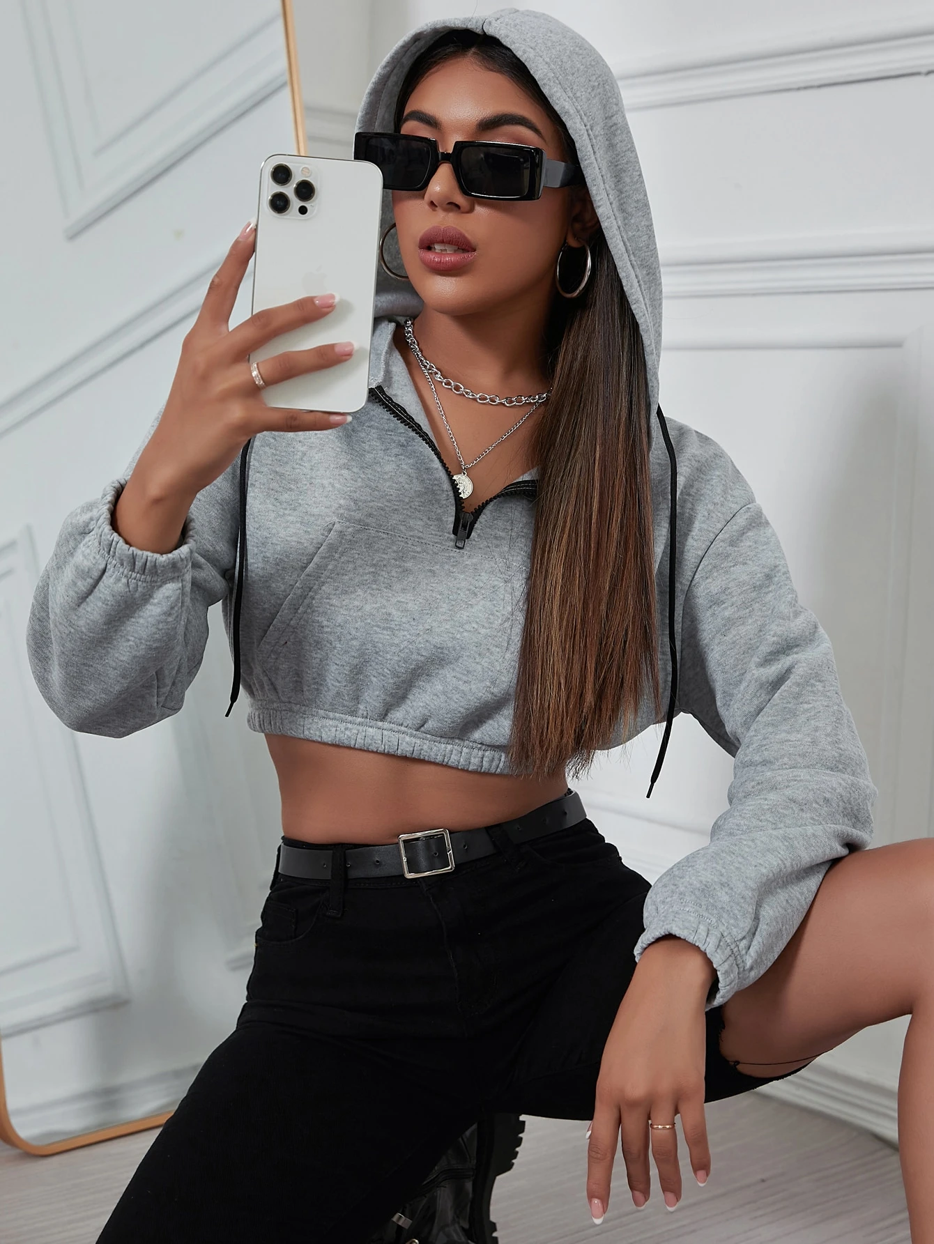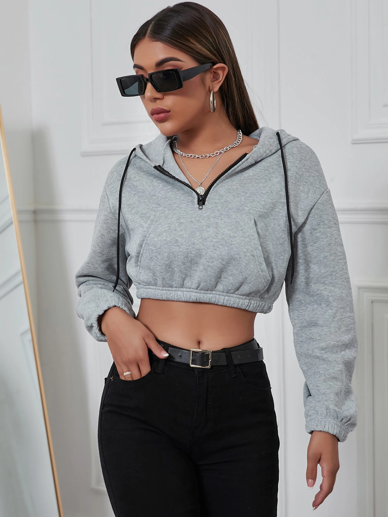 COZZY – Sweat-shirt court col camionneur à poche kangourou à capuche Gris